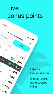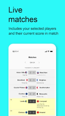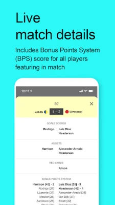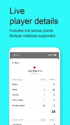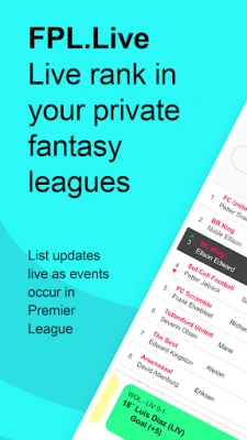 Live lists (season/gameweek) are updated live as events happen Live events (goals, assists, clean sheets etc.) Live bonus points Livescore of Premier League matches Captain and chip picks Push notifications on events of your own players